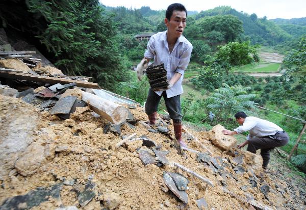 5月20日,广西融安县雅瑶乡雅瑶村大弄屯,村民在倒塌的房屋前清理可用的物品。
