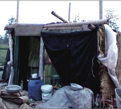 在广平县城郊的焦庄村,有一个用竹子、草帘和塑料布搭成的不足10平方米的窝棚,女主人名叫李运得,她与丈夫挤住在这里,孩子借住在别人家。