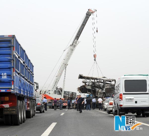 5月23日3时左右长深高速公路辽宁境内发生一起特大交通事故,一辆大货车因方向辨别错误,逆向行驶,与一辆正常行驶豪华卧铺大客车相撞起火,截至目前已经造成32人死亡,21人受伤。这是抢救人员在交通事故现场进行事故处置。新华社记者 李钢摄