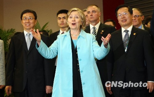5月22日,美国国务卿希拉里·克林顿参观上海世博会中国馆动态清明上河图。 中新社发 杜洋 摄