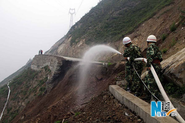 5月30日,消防官兵正在用高压水枪为垮塌山体排险。5月29日,四川省阿坝藏族羌族自治州汶川县一处山体塌方,造成213国道汶川段彻底中断,并有一条通村半山公路出现约50厘米宽的裂缝,但没有发现人员伤亡。这是2008年“汶川特大地震”发生后,这条有着“震中生命线”之称的国道第三次因山体大塌方中断。新华社发(汶宣摄)