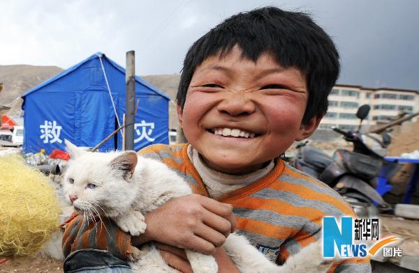 2010年5月31日 难以忘却 玉树的微笑小天使 9岁的藏族男孩欧亚才瓦抱着他在地震后救护的流浪猫坐在自家的帐篷前(4月18日摄)。青海玉树灾区那些天真可爱的孩童,还有他们天使般的微笑永难忘却。在地震废墟上,孩子们的微笑孕育着生机和希望:擦干眼泪,挺起脊梁,生活仍在继续。新华社记者 侯德强 摄