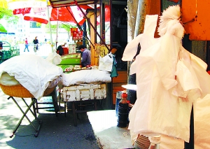 记者近日在北京市宣武区老墙根菜市场看到,来这里买菜的人走出市场时,每人手里都提着几个装着菜的各种颜色的超薄塑料袋。记者发现,顾客在市场里买菜时,每买上一样菜,卖菜的摊主就拿出一个超薄塑料袋把菜装上,一会儿工夫,顾客手里就提了好几个塑料袋。
