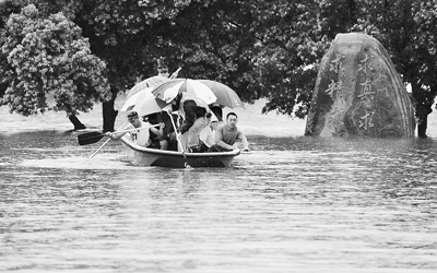 实验中学内一片汪洋,很多绿化树只能见到树冠,宣传栏只露出水面半截。因皮划艇和冲锋舟不够,救援人员只能带领学生们分批撤离。直到17时左右,学生才转移完毕。