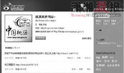 记者:是这样的,桃源县去年11月2号首次开通了新浪微博,开始了政府网络问政的尝试,这是湖南省乃至全国第一家政府微博,开通了半年多时间里,桃源微博经历了一个由政级发布平台到注重桃源风土人情宣传以及注重与网友互动的改变,我登陆网站,他们开通的初衷就是向网友推荐桃源的历史文化以及美丽风景,主要是由它的信息办维护,桃源微博开通的前几天,发布的信息主要是一些官方性的新闻,比如像领导采访和县政府活动等信息,也没有网友跟贴和转发,直到11月18号开始,桃源微博主要的信息发布发生了改变,信息大多数是本地的自然风景和历史文化以及旅游资源和土特产等等,桃源微博的回归是吸引了大量的粉丝,到今天下午微博的粉丝已经有7300多人,主博文已经发出了705篇,加上与网友互动过程中进行了评论和回复,一共有两千多条,几乎每一条博文后面都有网友的转发和跟评。