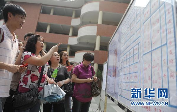 6月6日,考生和家长在广州市第七中学考场查看考场平面图。 2010年全国高考将于6月7日举行,广州市的57个考场于6日下午3点至4点开放供考生踩点,让考生们提前熟悉考试环境和教室位置。新华社记者 卢汉欣 摄