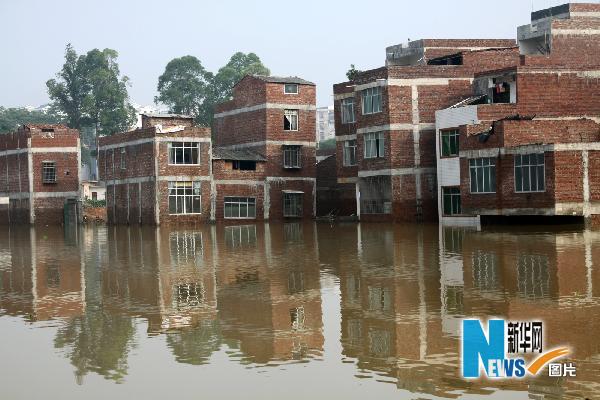 6月5日拍摄的来宾市内涝严重的凌窝地区一角。5月31日至6月1日,广西来宾市遭受强降雨袭击,降雨量超过200毫米的乡镇有16个,来宾市市区降雨量最大,达439毫米,远远超过历史最高记录311毫米。至5日上午,由于排水不畅,来宾市兴宾区一处叫凌窝的区域依然内涝严重,许多房屋仍被泡在水中。新华社发(覃刚 摄)