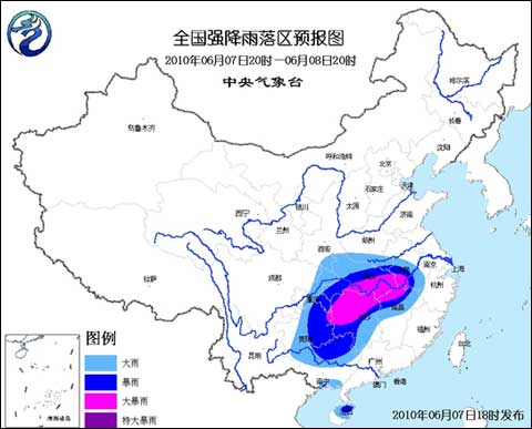 预计,6月7日20时到6月8日20时,陕西东南部、河南南部、湖北、安徽中南部、江西北部、湖南大部、贵州大部、重庆大部、广西北部和南部、海南中北部等地有大到暴雨,其中,贵州东北部、湖南北部、江西西北部、湖北南部、安徽西南部等地的部分地区有大暴雨。