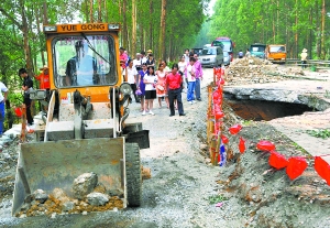 日前,在广西来宾市兴宾区桥巩乡,推土机在抢修来宾市至合山市的二级公路。广西自治区交通厅最近数据显示,受强降雨影响,造成广西113公路交通中断,其中国道3条、省道1条、县道52条,其它通乡通村公路57条,经全力抢修,目前已抢通公路71条。新华社发