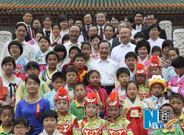 6月11日下午15时许,中南海紫光阁前,一群身着鲜艳民族服装的中韩两国少年儿童,欢呼雀跃地拥向国务院总理温家宝,紧紧围在他身边。