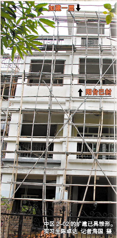 昨日(12日)上午,记者来到南浦海滨花园探营,发现3幢别墅的外墙正搭着脚手架。从施工情况来看,中区2-02别墅扩建的别墅已现雏形,不仅比周围的别墅高出一层,外面还凸建出一段。记者走进去一看,原来2层的天台已向外凸建并被封闭成房间,小阳台也被封闭起来,多建的楼梯通向3层天台。“改建后,多了50多平方米”,现场的施工人员说,改建工期大约要4个月,记者看到墙上还张贴着物管公司的装修许可证。