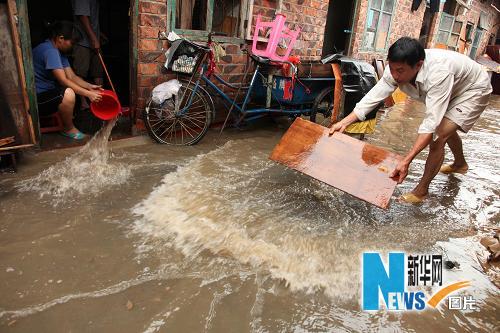 6月15日,在南宁市广西医科大学第二附属医院附近的居民区,居民在屋前排水。当日,广西南宁市遭遇暴雨袭击,气象部门发布暴雨红色预警信号,市区部分地段严重内涝,市郊一些农用设施被毁。新华社发(唐辉吉 摄)
