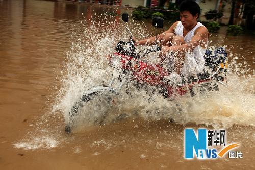 6月15日,南宁市一位男子骑着摩托涉水而行。当日,广西南宁市遭遇暴雨袭击,气象部门发布暴雨红色预警信号,市区部分地段严重内涝,市郊一些农用设施被毁。新华社发(唐辉吉 摄)