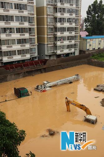 6月15日,南宁市某小区工地的货车和大型工程机械浸泡在水中。当日,广西南宁市遭遇暴雨袭击,气象部门发布暴雨红色预警信号,市区部分地段严重内涝,市郊一些农用设施被毁。新华社发(唐辉吉 摄)
