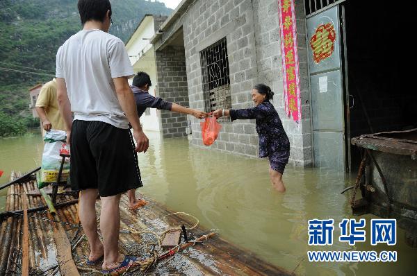 6月15日,在广西东兰县三石镇公平村拉平屯,救援人员给受灾群众送食物。 6月13日和15日凌晨,广西东兰县再遭强降雨袭击,导致三石镇公平村拉平屯内涝严重,120余人被困。灾情发生后,当地立即组织海事、消防、防汛等部门投入救灾。目前尚未有人员伤亡报告。新华社发(韦礼富 摄)