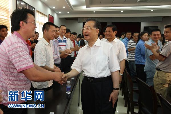 6月14日,在中华民族传统佳节端午节来临之际,中共中央政治局常委、国务院总理温家宝先后来到北京市儿童福利院、西城区富国里社区、地铁6号线平安里站施工工地,看望孤残儿童和城市低保户,了解农贸市场蔬菜供应和价格情况,召开新一代农民工座谈会。这是温家宝在北京地铁6号线平安里站施工工地会议室召开新一代农民工代表座谈会。新华社记者姚大伟摄