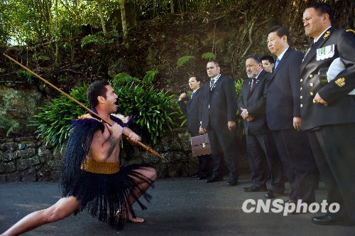 国家副主席习近平于当地时间6月17日抵达奥克兰,开始对新西兰进行正式访问。图为在奥克兰总督府,新西兰方以毛利人传统仪式迎接习近平一行。 中新社发 胡旭君 摄