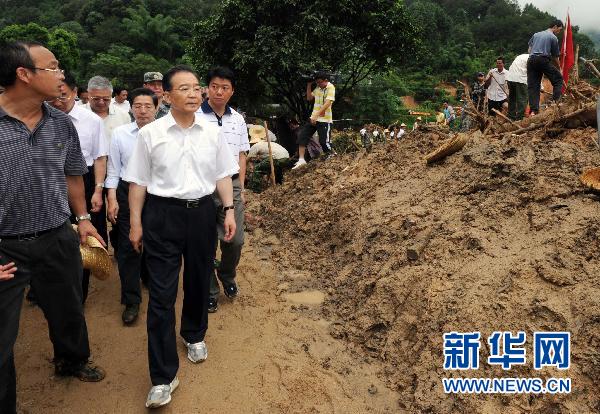 6月19日至20日,中共中央政治局常委、国务院总理温家宝来到广西梧州市,实地察看汛情、灾情,慰问奋战在抗洪救灾一线的干部群众,主持召开会议,部署防汛抗洪救灾工作。这是6月20日,温家宝总理冒雨来到大山深处的苍梧县沙头镇双尚村杉木坪自然村,察看因山体滑坡、泥石流造成的灾情。新华社记者李涛摄
