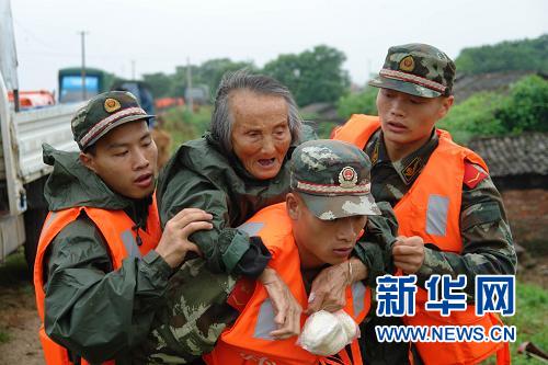 6月22日,武警官兵在转移被洪水围困的群众。受持续强降雨影响,江西抚河暴发特大洪水,6月21日晚,位于抚河干流的抚州市临川区唱凯堤出现决口,威胁下游5个乡镇、京福高速公路、316国道以及12万亩粮田的安全。新华社发(周勇敢 摄)