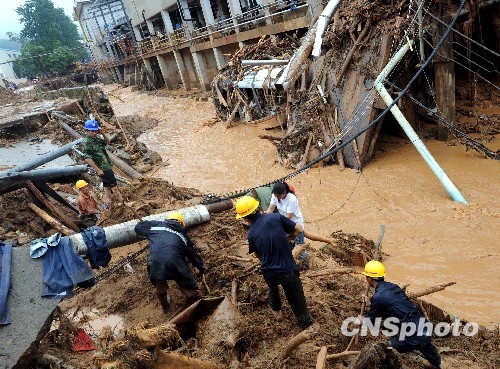 6月22日下午,福建南平市供排水部门的工作人员在该市延平区安丰路被洪水冲垮的路段抢修自来水供应管道。自6月13日以来,福建连续遭受特大暴雨袭击,造成了历史罕见的自然灾害,截至21日16时初步统计因灾死亡76人、失踪79人,直接经济总损失95.51亿元人民币。 中新社发 刘可耕 摄