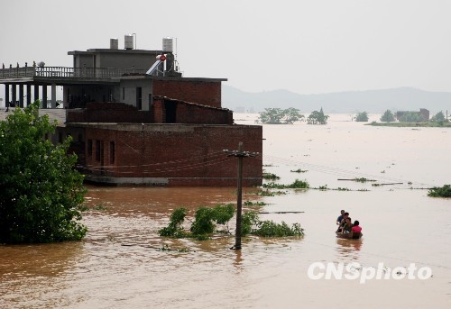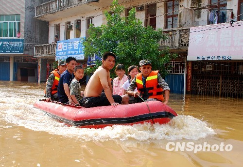 6月23日,南京军区战士继续奋战,救助灾区群众。江西第二大河抚河21日决堤,严重威胁下游5个乡镇14.5万人口的安全,南京军区战士连续奋战解救受困群众。 中新社发 何柳斌 摄