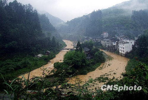 从6月23日凌晨开始,贵州省雷山县再次遭到暴雨袭击,多条河段猛涨。 中新社发 杨昌澌 摄