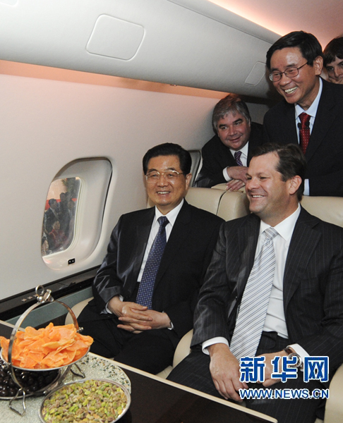 6月26日,国家主席胡锦涛在多伦多参观庞巴迪飞机制造厂。这是胡锦涛主席在该公司研制的新型飞机客舱里了解飞机性能和采用的先进技术情况。新华社记者 李学仁 摄