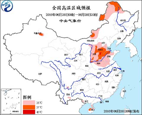 中央气象台2010年6月28日06时继续发布高温蓝色预警:预计,今天白天,内蒙古东北部和中部的部分地区、黑龙江西北部、山西、河北大部、天津、河南中北部、山东中西部、安徽北部、江苏西北部、广东雷州半岛、海南北部等地有35~37℃、局地38℃的高温天气,其中,河北南部的局部地区最高气温可达40℃。