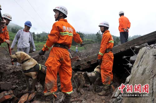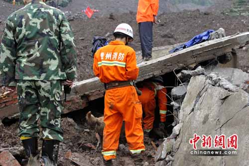 29日,消防官兵在贵州关岭山体滑坡现场携搜救犬在泥泞中工作。