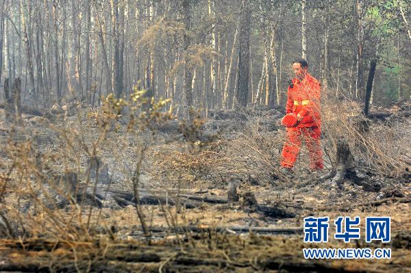 6月30日,一名森警战士走过一处过火林地。内蒙古越界火6月26日烧至黑龙江大兴安岭境内后,目前在黑龙江大兴安岭林区参与灭火的人员已达12000人。 新华社记者 王松 摄