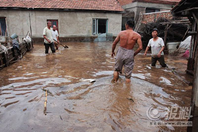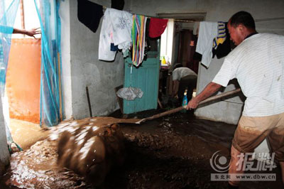 铁岭镇铁岭二村村民正在家中排除积水。庄文斌摄(图片来源:东北网)