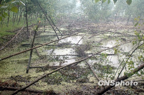 7月1日凌晨,狂风伴着暴雨袭击了山东省东南部的郯城县,导致部分广告牌和民房损坏,沂河湾处200余棵树木被刮倒,没有造成人员伤亡。 中新社发 房德华 摄