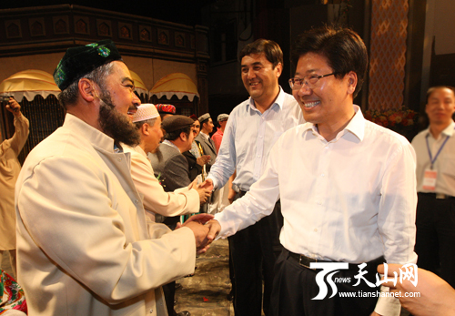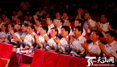 自治区领导韩勇、李屹、肖开提·依明、努尔兰·阿不都满金、白志杰、尔肯江·吐拉洪等一起观看演出。(记者王丽丽 金浩摄影报道)
