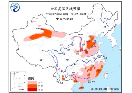 据中广网报道,中央气象台首席预报员孙军介绍说,5日高温天气仍然持续。南方地区的范围稍微缩小一些。在江南的东南部、华南还会有35℃-37℃。华北地区的高温范围和强度会有所扩大,在京津、河北、山西南部、山东、河南这些地区会有35℃-37℃,局部地区会有38℃到40℃的高温天气。
