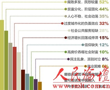 “腐败多发,民怨较重”(占52%),“贫富分化,阶层固化”(占44%)分别排在第一位和第二位