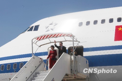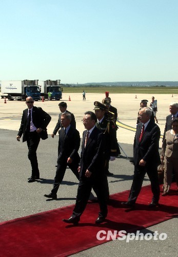 应法国国民议会议长阿夸耶、参议院议长拉尔谢的邀请,中国全国人大常委会委员长吴邦国7日下午抵达法国首都巴黎,开始对法国进行正式友好访问。中新社发 张蔚然 摄