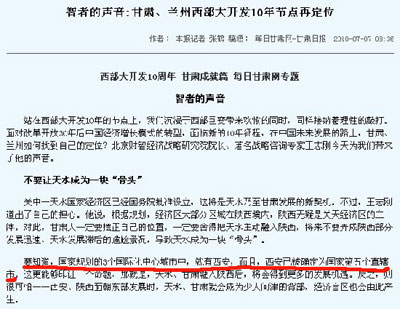 7月7日,《甘肃日报》撰文称著名战略咨询专家王志纲在兰洽会上透露“西安已被确定为国家第五个直辖市”,记者今天早上与《甘肃日报》取得联系,当事记者称,直辖市之说系自己从网络上搜索到的,并没有确切消息。