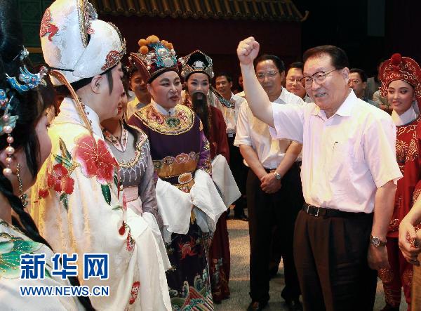 7月11日,首届全国民营艺术院团优秀剧目展演在北京落下帷幕,中共中央政治局常委李长春观看闭幕演出。这是演出结束后李长春与闭幕演出古装越剧《状元未了情》演员亲切交谈。新华社记者庞兴雷摄