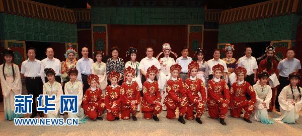7月11日,首届全国民营艺术院团优秀剧目展演在北京落下帷幕,中共中央政治局常委李长春观看闭幕演出。这是李长春等上台与闭幕演出古装越剧《状元未了情》演员合影。新华社记者庞兴雷摄
