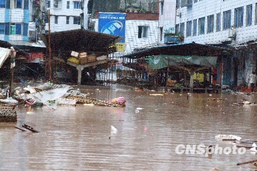 2010年7月10日11时左右暴雨再次袭击重庆市万州区分水镇,场镇农贸市场、小学、老林口农贸市场等局部地区洪水高峰时期深达1.5米左右。中新社发 赵俊超 摄