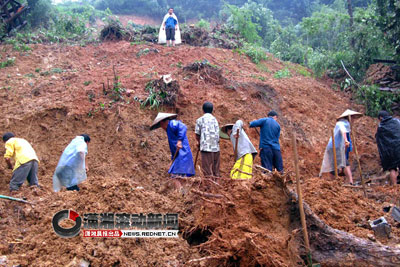 由于通往事发现场的道路被水冲断,导致大型挖掘机械短时间内无法达到现场,现场一度采用人工挖掘。12日下午3点左右,3名遇难村民被挖出。到下午5点多,当地政府紧急调运一台大型挖机赶到现场进行挖掘。13日早上8点20分左右,另外3名遇难者遗体也被找到。