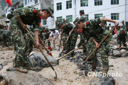 云南省昭通市巧家县小河镇镇政府所在地近日因遭受暴风雨袭击,引发特大滑坡泥石流灾害。图为驻地的武警云南总队昭通支队150名官兵第一时间赶赴现场参与抢险救灾。 中新社发 谢学浩 摄