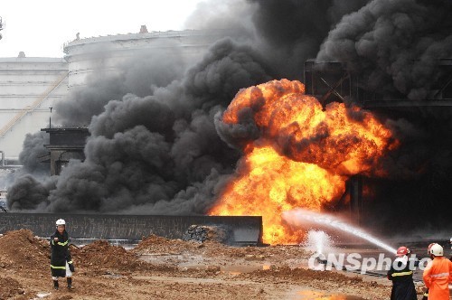 7月17日,消防队员在火灾现场扑火。当日10时,大连市政府召开新闻发布会,宣布大连新港输油管道爆炸现场储油罐的所有阀门全部关闭,火势基本扑灭,事故未造成人员伤亡。16日18时许,大连新港附近中石油的一条输油管道发生爆炸起火。起火管道为直径900毫米的原油储罐陆地输油管线,后引起700毫米管线起火,油罐没有起火。燃烧产生气体主要为含硫和芳烃类气体,无剧毒。 中新社发 刘德斌 摄