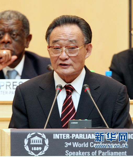 7月19日,全国人大常委会委员长吴邦国出席在瑞士日内瓦举行的第三次世界议长大会开幕式,并在大会上作题为《实现千年发展目标国际社会义不容辞》的重要发言。新华社记者 鞠鹏 摄