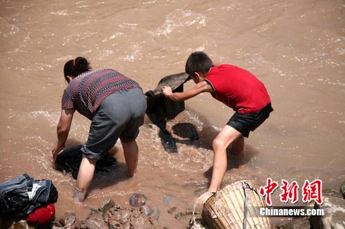 灾民在河中清洗被淤泥浸泡后的衣服。张浪 摄