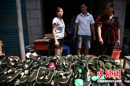 万源坪溪一零售鞋商老板晒自己清洗后的胶鞋。张浪 摄