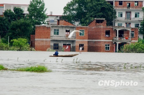 自7月8日21时开始,江西乐平市普降大到暴雨,平均降雨量160毫米,局部地区达250毫米,强降雨导致该市浯口镇产生了严重内涝灾害,相邻的程家墩、杨溪、桃园三村处在一片汪洋之中,成为了“孤岛”。 中新社发 朱定文 摄