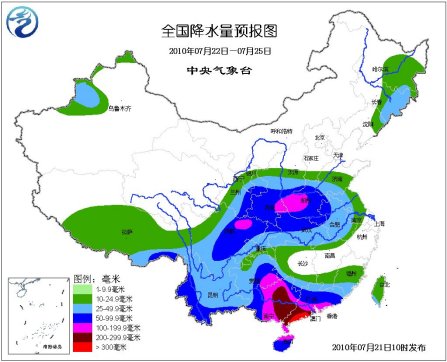 21-24日,华南大部及贵州等地将有50-80毫米降雨,其中广东中南部、广西中东部等地有100-180毫米,局地雨量可达250-300毫米。