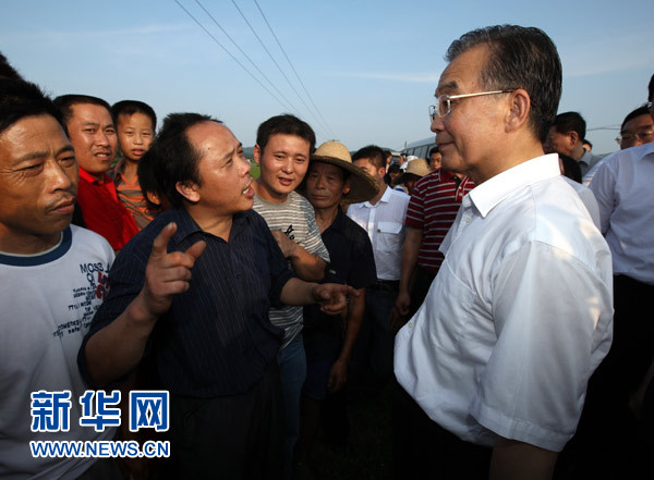 7月1日下午,中共中央政治局常委、国务院总理温家宝来到湖南考察防汛抗洪工作。图为陈凯旋挤到总理面前说:“温总理,我向您反映一个问题。”新华社记者姚大伟摄