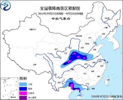 中央气象台2010年7月23日06时继续发布暴雨黄色预警: